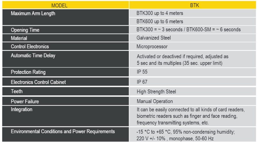 Electromechanical tyre killer with arm barrier is one of the highest security vehicle access control systems in which a vehicle without permission cannot enter. Tyres of the unpermitted vehicle splits open immediately, therefore the vehicle moves only a few more meters and is stopped. The product stops vehicles coming from both directions. Teeth of tire killer move all together. Drive unit is placed to one end of the tyre killer, it stands above the ground level. The arm barrier, which is connected to the drive unit, is another safety feature. It is a mechanism that allows the passage of vehicles by working together with tyre killers.